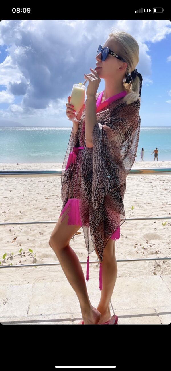 Kimono plażowe wykonane ręcznie z przewiewnej, szybkoschnącej tkaniny. Nie gniecie się co sprawia, ze zawsze wyglada elegancko. Aplikacja na plecach lśni nadając wyjątkowy i niepowtarzalny charakter. Kimono wykończone frędzlami w kolorze fuksji.